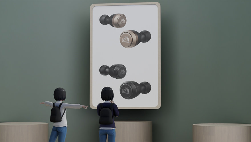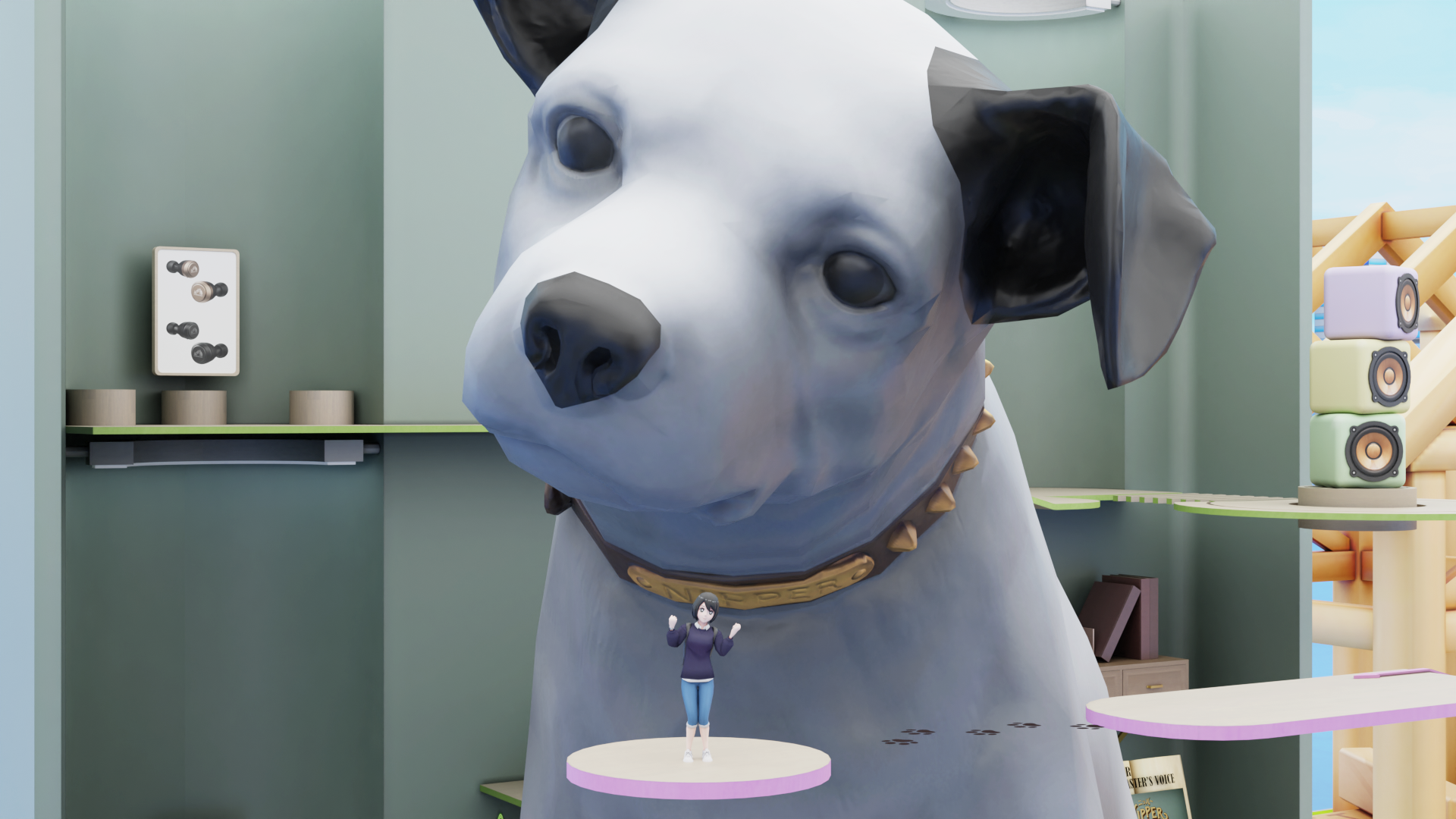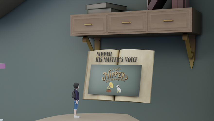 エリア内で、「Victor」のロゴがプリントされたアバター着せ替えアイテムと、ブランドのアイコンである「ニッパー」のサブアバターを配布しています。ニッパーのサブアバターを手に入れると、ニッパーと一緒にワールド内を歩くことができます。