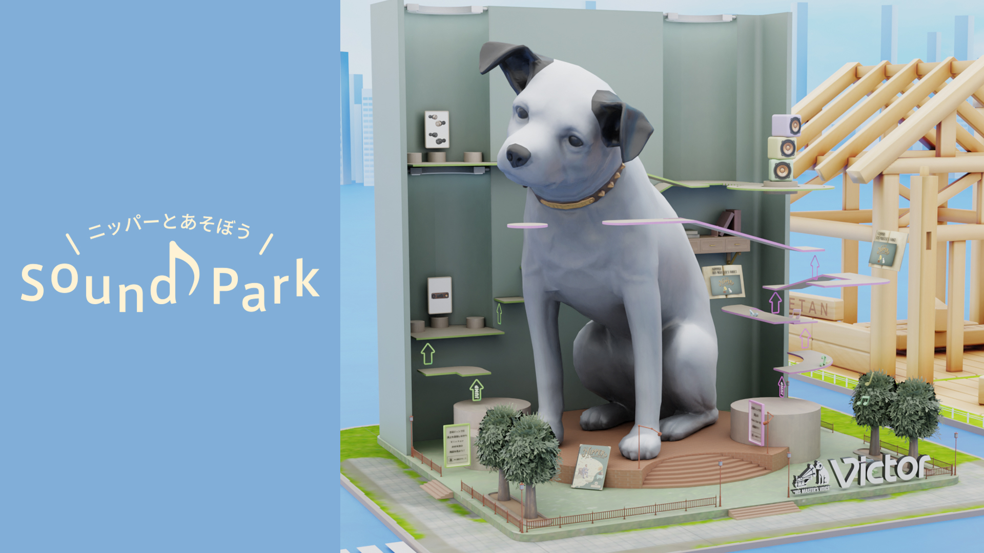 Victorの動画が流れる仮想アルタビジョンの前のターミナルから「ニッパー」の足跡をたどっていくとパークへ。パーク内にはアスレチックや製品・絵本の紹介など、「Victor」の世界観を体感できるエリアとなっています。