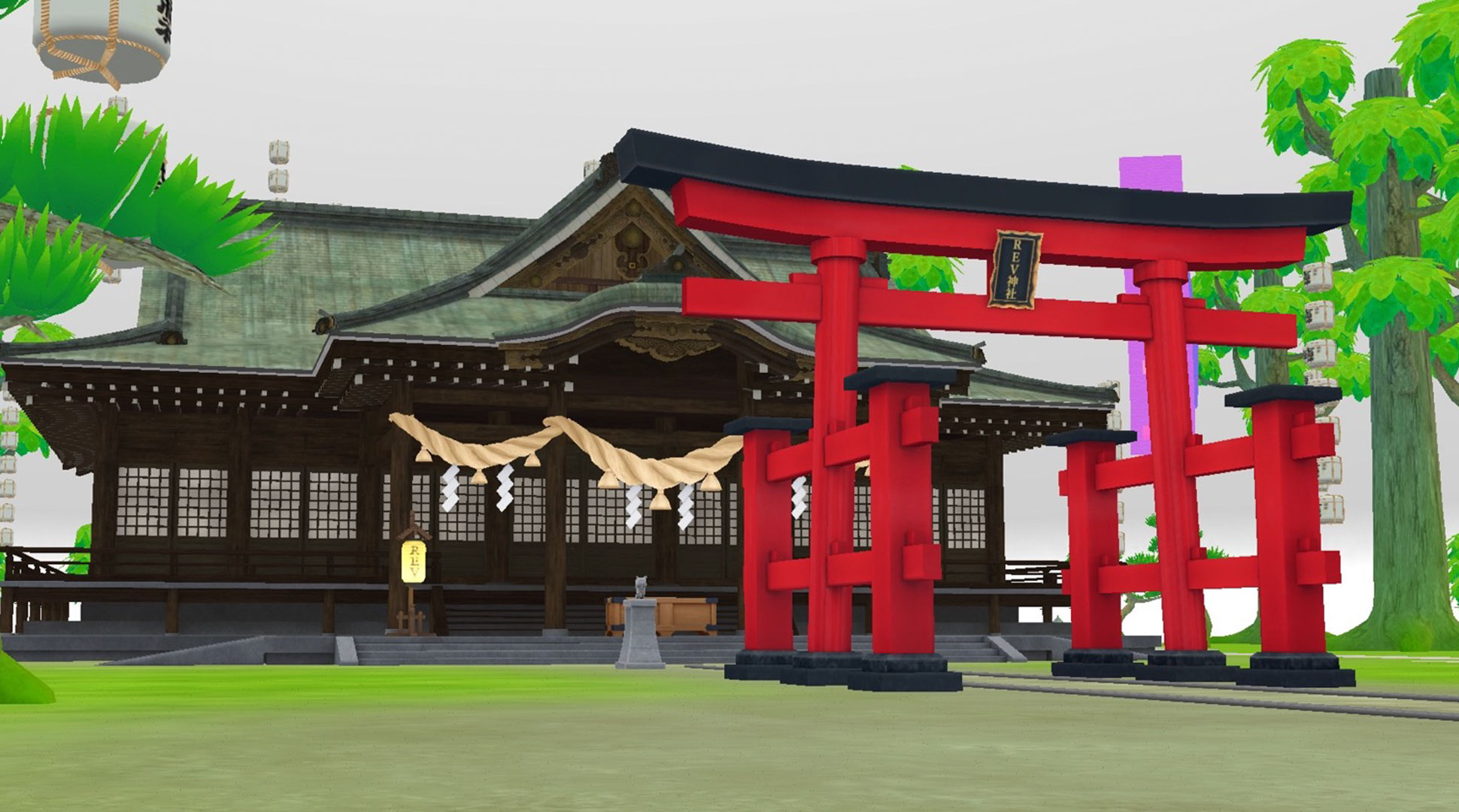 仮想伊勢丹新宿店のとなりにあるREV神社。森に囲まれて、ひっそりとREV WORLDSを見守っています。イベントやお祭りが開催されることも。
